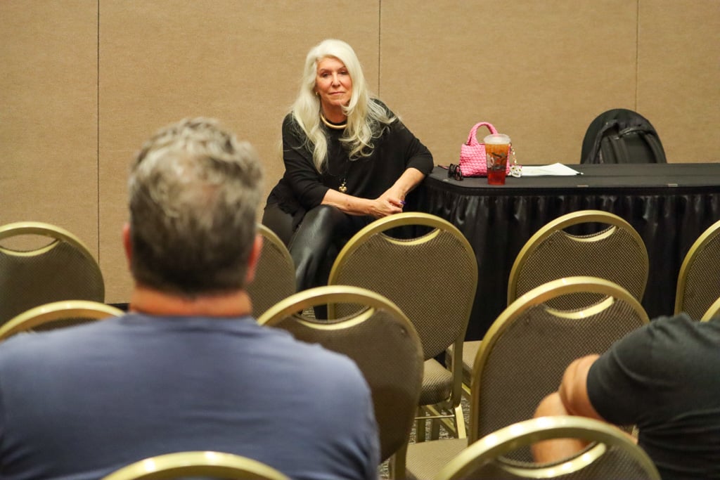Lauri Kibby speaks with a neighbor of the Dream Hotel project during a community meeting Thursday. |