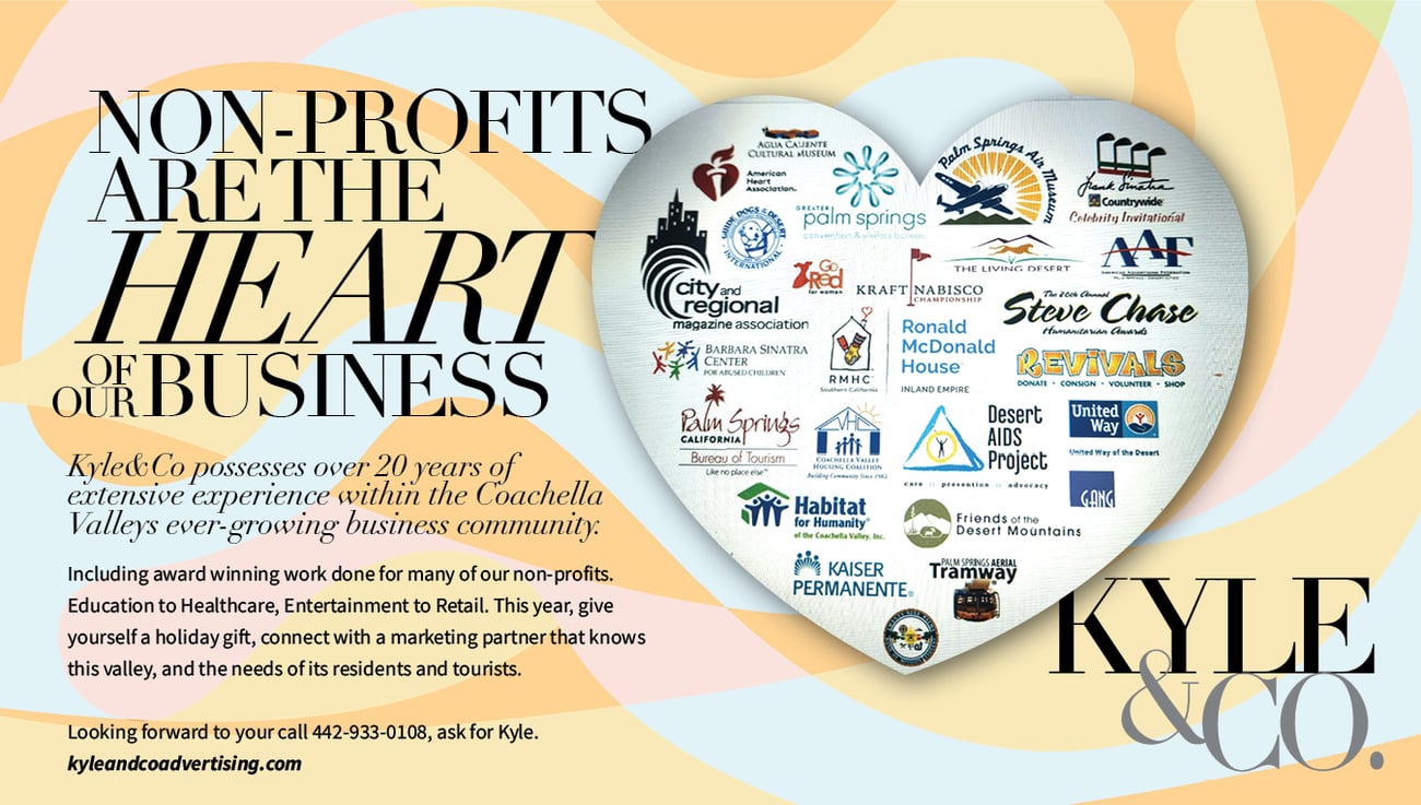Kyle&Co possesses over 20 years of extensive experience within the Coachella Valleys ever-growing business community. Including award winning work done for many of our non-profits. Education to Healthcare, Entertainment to Retail. This year, give yourself a holiday gift, connect with a marketing partner that knows this valley, and the needs of its residents and tourists. |