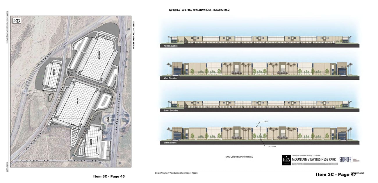 The big picture: The Desert Mountain View Business Park would span 217 acres of tribal trust land west of Tipton Road, between Interstate 10 and Highway 111, featuring four warehouse buildings ranging from 248,000 to over 1.1 million square feet.